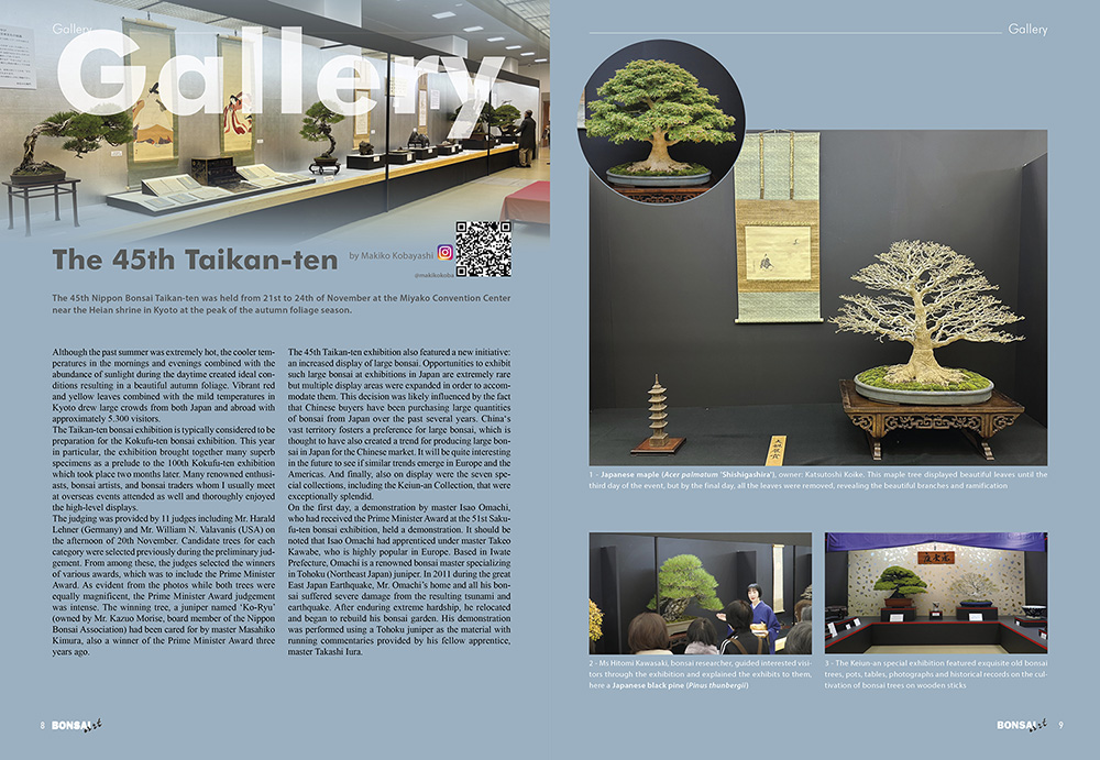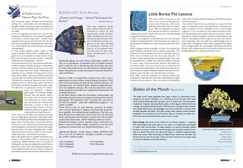 Short articles featuring bonsai pots, shohin of the month, kusamono/shitakusa, botany topics, information about our cover tree, a book review and our humorous-ironic column “Mixed Spices”.