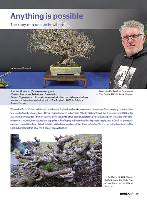 The Toringo crabapple on the cover of this issue is a mature, old bonsai, originally collected in Japan as a yamadori. With its fresh, delicate blossoms, it symbolizes the new beginning of spring, as well as the launch of this English pilot issue of the BONSAI ART magazine, which until then had been published exclusively in German since 1993.